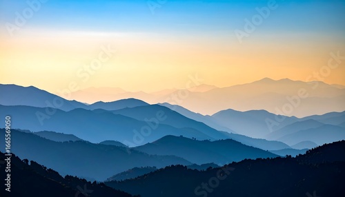 © Anggita, Fototapeta premium Sunset over layered mountain range.
