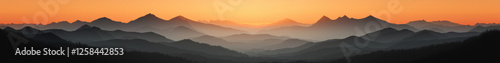 © Photo Graphic Stock, Fototapeta premium Sunset over layered mountain silhouettes in serene landscape