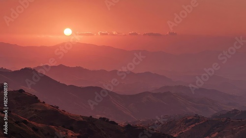 Fototapeta premium Sunset over layered mountains with an orange-pink sky and hazy silhouettes....