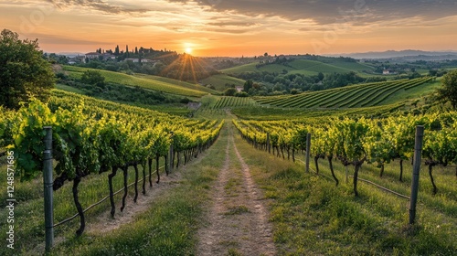 © Popelniushka, Fototapeta premium Sunset Over Levizzano Rangone Vineyards: A Scenic Landscape in Emilia Romagna, Italy