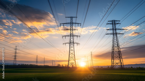 © javu, Fototapeta premium Sunset over lush field with towering power lines.