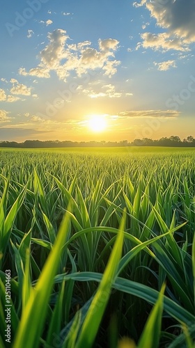 Fototapeta premium Sunset over lush green field, nature background, idyllic rural scene