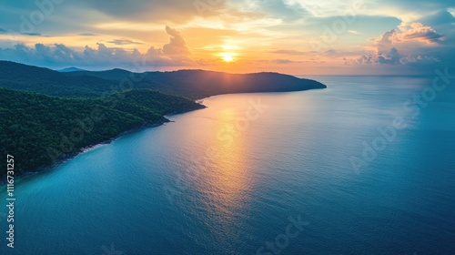 © Anak, Naklejka premium Sunset Over Lush Green Island Coastline And Ocean