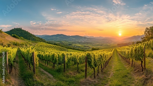 Naklejka premium Sunset Over Lush Green Vineyards and Rolling Hills