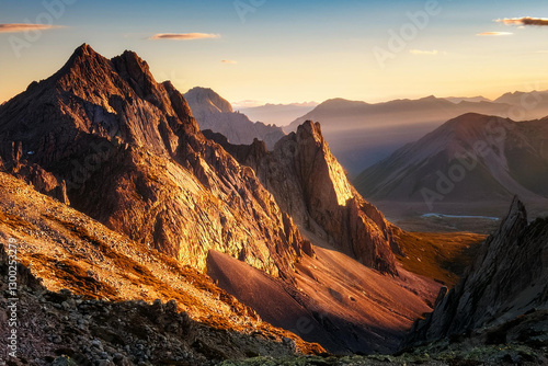 © Doğukan, Obraz premium Sunset Over Majestic Mountain Landscape with Warm Golden Light