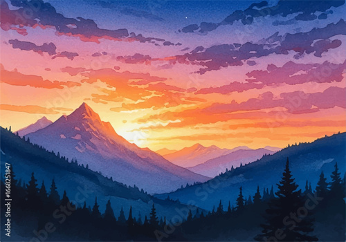 © yayan, Obraz premium Sunset Over Majestic Mountain Peaks Illustration
