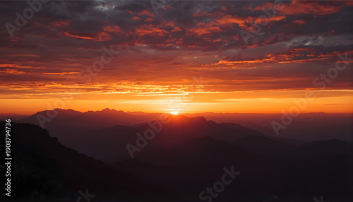 © zukigallery, Obraz premium sunset over majestic mountain range with dramatic golden sky