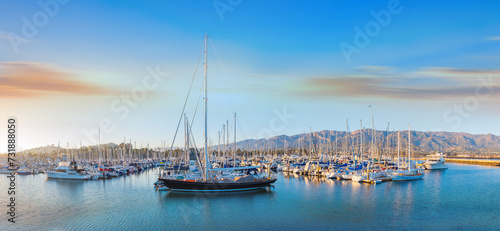 Fototapeta premium Sunset over Marina with docked boats with Santa Barbara Mountains on the background
