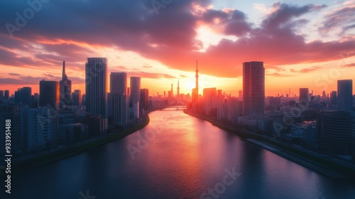 © Andrii , Fototapeta premium Sunset Over Modern City with River and Tall Structures