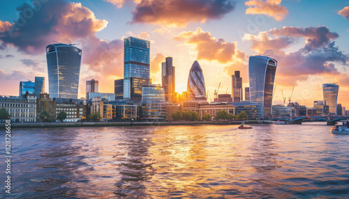 © The Stock Photo Girl, Fototapeta premium Sunset Over Modern Skyline with Office Buildings