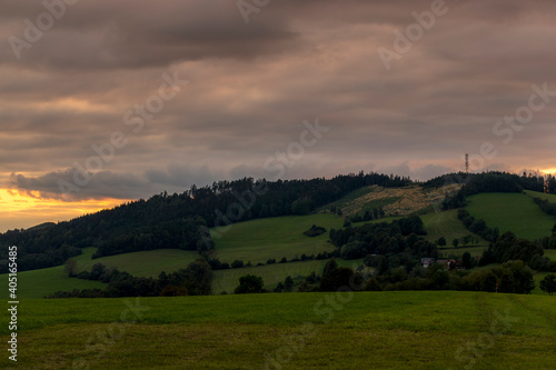 Obraz premium Sunset over mountains and hills with colorful clouds on the horizon that...