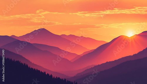 © HridoyDesigns, Obraz premium sunset over mountains colorful sky orange and pink hues silhouette of hill