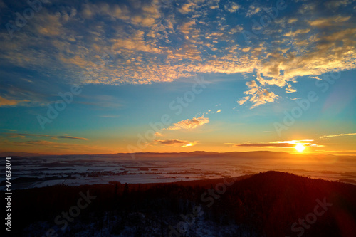 Obraz premium Sunset over mountans with forest covered with snow, beautiful winter...
