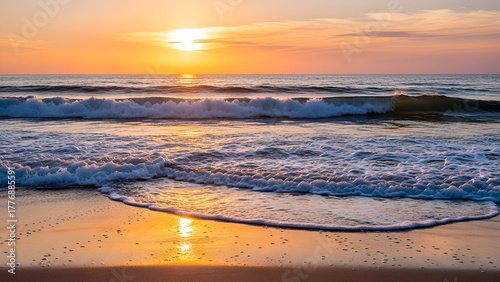 © Ridwan, Naklejka premium Sunset Over Ocean Waves Calm Beach Scene with Vibrant Colors and Soft Lighting