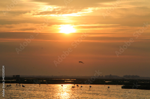 © FarazHabiballahian, Naklejka premium sunset over pond of flamingos