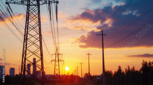 © Worakit, Fototapeta premium Sunset over power lines with silhouettes of towers and buildings in background, creating serene atmosphere