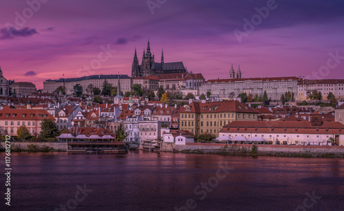 © rik85, Obraz premium Sunset over Prague showcasing historic architecture and serene river reflections