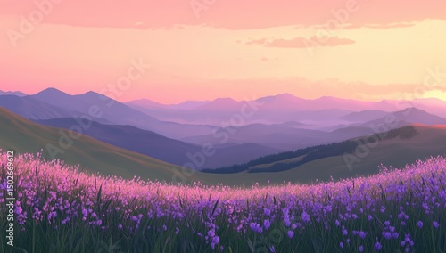 © Qohhar, Fototapeta premium Sunset over purple mountain flowers