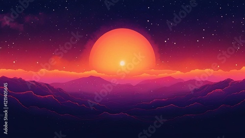 Fototapeta premium Sunset over purple mountains, starry night sky, digital art, desktop wallpaper