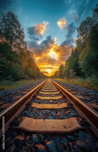 © galendra, Fototapeta premium Sunset over railway tracks through forest