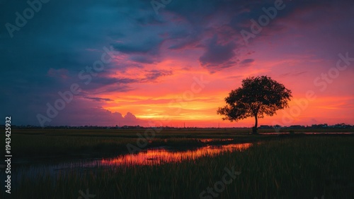 © Vibu design gallery, Obraz premium Sunset over rice field with lone tree