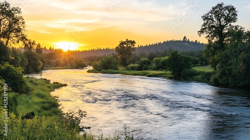 © Tiramisu, Obraz premium Sunset over river and trees with vibrant colors and landscape