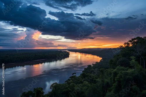 © Butsarakham, Fototapeta premium Sunset Over River Through Forest Landscape Photography View With Cloudscape
