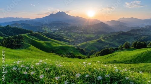 © BROPRADANA, Naklejka premium Sunset over rolling green hills and village