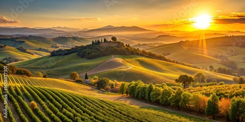 Fototapeta premium Sunset over rolling hills and vineyards with golden light illuminating the landscape, serra san quirico
