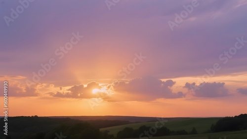 Obraz premium Sunset Over Rolling Hills with Dramatic Purple and Orange Sky
