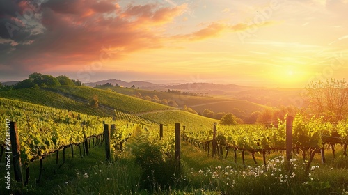 Naklejka premium Sunset over Rolling Hills with Vineyards and Lush Green Foliage