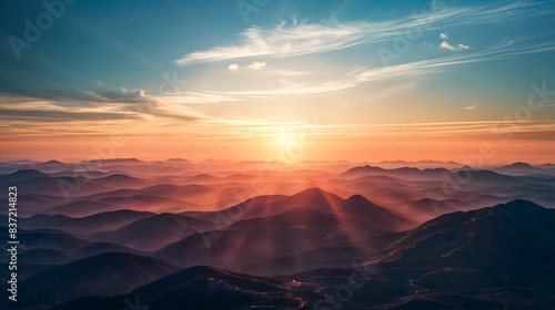 © engkiang, Naklejka premium Sunset over rolling mountains with a colorful sky