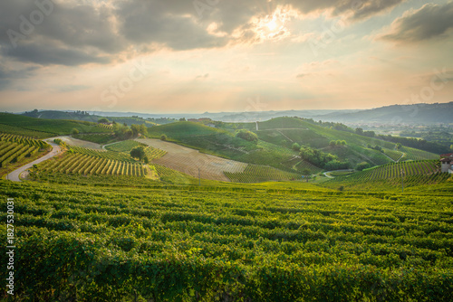 Naklejka premium Sunset Over Rolling Vineyards of Langhe near Barbaresco and Neive, Italy