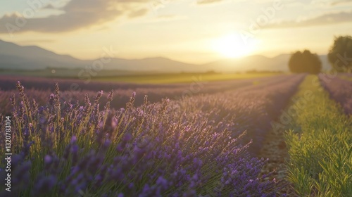 Naklejka premium Sunset over rows of blooming purple lavender in a field.