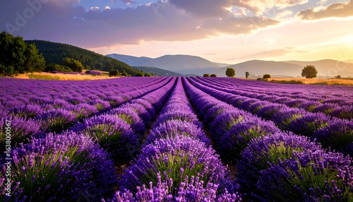 © Kay, Naklejka premium Sunset over rows of purple lavender in a vast field, mountains in the distance