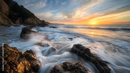 © Always, Obraz premium Sunset Over Rugged Cliffside Beach with Crashing Waves
