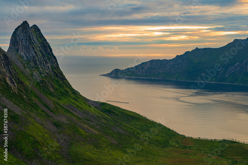 Naklejka premium Sunset over Senja island in Northern Norway , mount Hesten in the middle of...