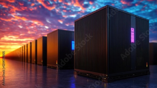 Obraz premium Sunset over server farm; data center computing; cloud storage; digital infrastructure