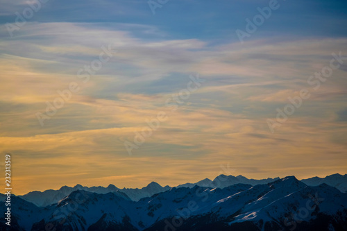 © Timm, Obraz premium Sunset over Snow covered Mountains