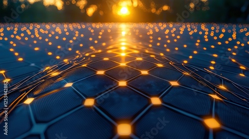 © mlangsen, Obraz premium Sunset over solar panel field, energy generation