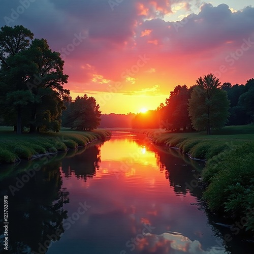 © Chanchai, Obraz premium Sunset over still river with trees in foreground, calm, cloud, landscape