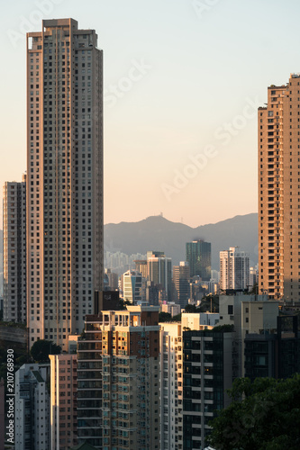© jakartatravel, Fototapeta premium Sunset over tall apartment tower in Happy Valley in Hong Kong island with the peaks of kowloon in the back in Hong Kong, China