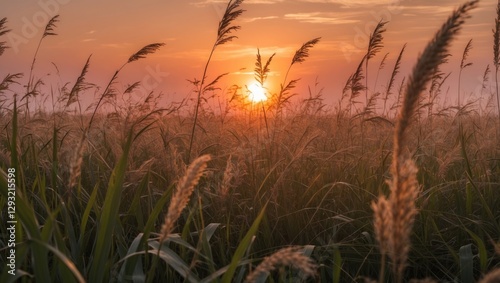 Fototapeta premium Sunset Over Tall Grass Field with Soft Lighting and Generous Copy Space for...