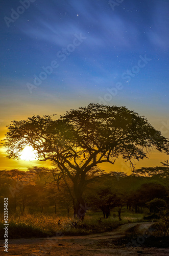 Obraz premium Sunset over the African savannah and its famous acacia trees