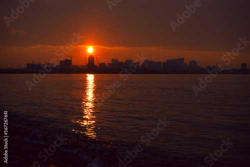 Naklejka premium Sunset over the city, Batumi , Adjara, Georgia. sunlight cityscape view of Batumi city at golden hour. Black Sea port of Batumi, capital of Adjara. Sun set. panorama of the city of batumi at sunset.