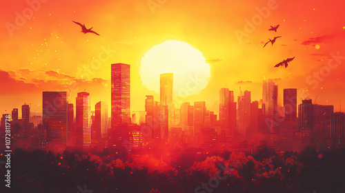© Thiago, Fototapeta premium Sunset over the city, futuristic city skyline with advanced infrastructure, modern urban development. Utopia. Illustration