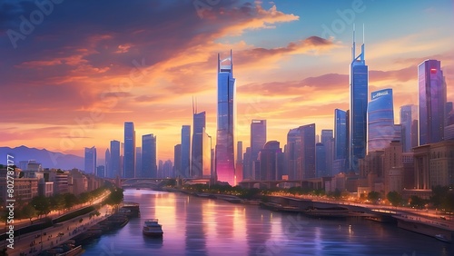 © Dove, Fototapeta premium sunset over the city : Twilight Metropolis Urban Splendor at Sunset