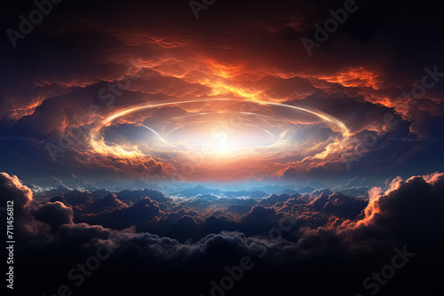 © Alexandra, Obraz premium Sunset over the clouds. Space background. Generative Ai