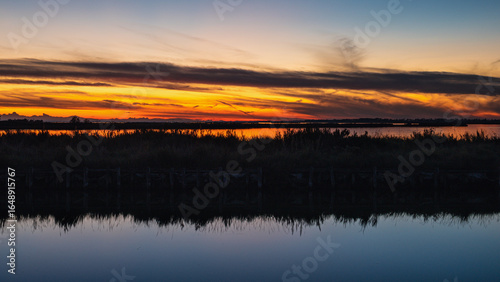 © fruttuoso, Fototapeta premium sunset over the lagoon, Po river delta, Comacchio, Ferrara, Italy