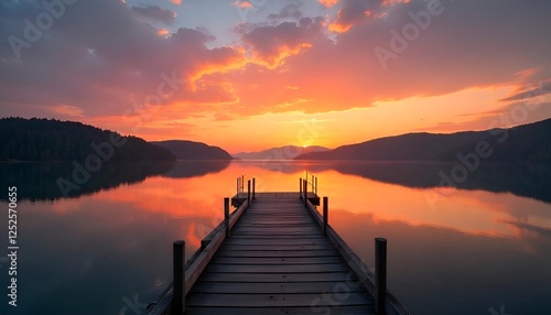 © Altaf, Naklejka premium Sunset Over the lake and wooden old pier,